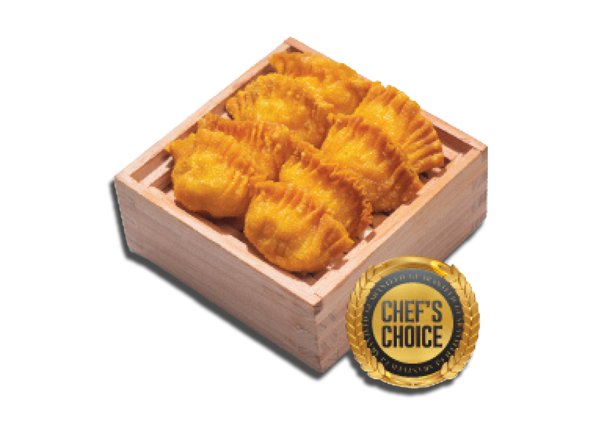 Golden wrapper reveals seasoned chicken, mushroom & chives, delivering a flavourful wonder.