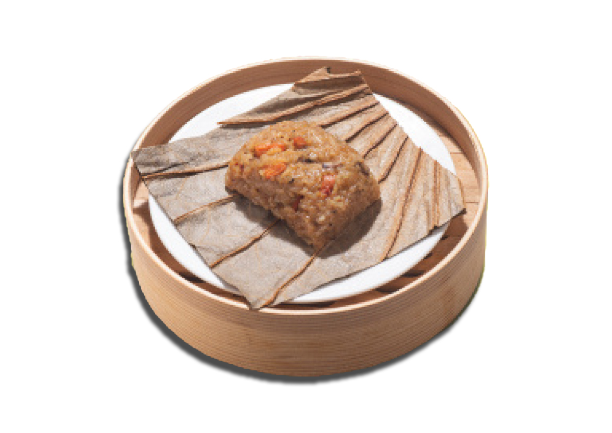 Aromatic glutinous rice mixed with chicken, dried shrimp & mushroom, wrapped in louts leaf.